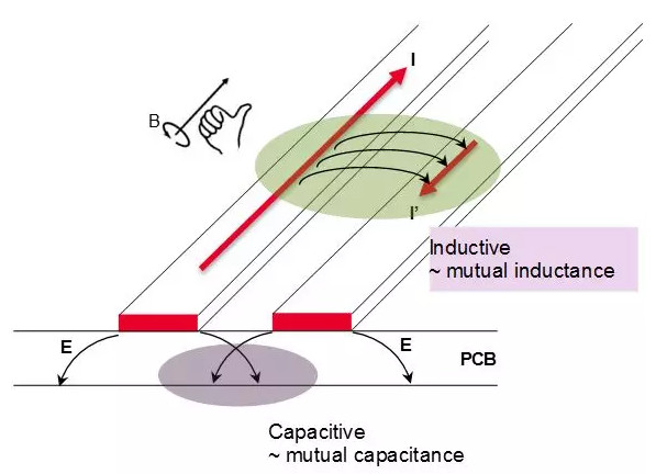 另外一方面,根據(jù)楞次定律,左面?zhèn)鬏斁€流經(jīng)電流發(fā)生變化引起磁通量的變化,被耦合到的右面的傳輸線形成反向電流,以阻礙入侵者磁通的變化。我們稱左面的為入侵信號(hào)或干擾源,右面的為受侵害信號(hào),這樣的磁場(chǎng)耦合,形成互感。