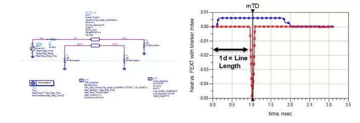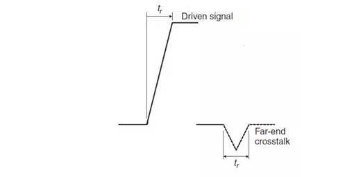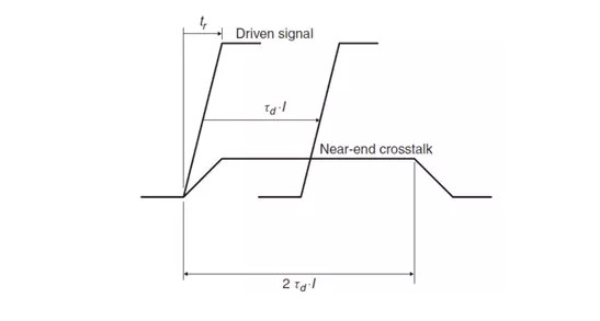 入侵階躍信號(hào)邊沿從源端開始傳輸,在受侵害鏈路形成反向傳輸波,一直到入侵信號(hào)抵達(dá)鏈路末端,受侵害鏈路反向傳輸波形在遠(yuǎn)端再經(jīng)過一個(gè)單程傳輸延遲傳到近端,這樣近端串?dāng)_形成的同向脈沖的寬度就是信號(hào)傳輸延遲的兩倍。