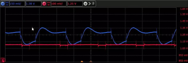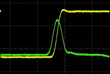 如果我們關(guān)閉受侵害鏈路,只打開串?dāng)_信號(hào),我們?cè)谑芮趾︽溌房梢悦黠@看到幾十毫伏的小脈沖,脈沖寬度接近干擾信號(hào)的跳變時(shí)間。