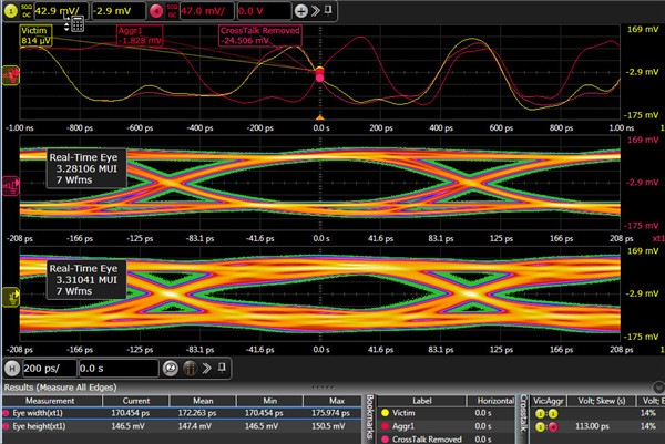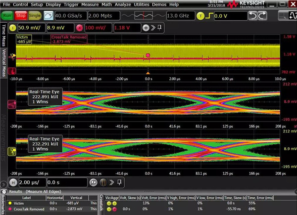 1高速鏈路間的串?dāng)_影響,我們打開遠(yuǎn)端串?dāng)_,利用N8834A分析工具(設(shè)置方法不此處贅述),將串?dāng)_源設(shè)定為串行信號(hào),軟件計(jì)算出來碼型長(zhǎng)度,理想碼型,以及計(jì)算出信號(hào)間的傳遞模型,計(jì)算出串?dāng)_源對(duì)受侵害信號(hào)幅度的影響程度為14%,信號(hào)自身的ISI影響約是14%,軟件將串?dāng)_源影響移出后,下圖屏幕中間的波形可以看到眼高和眼寬的結(jié)果和文章前面提到的原始沒有打開串?dāng)_條件下的波形是比較接近的,另外,分析工具也可以對(duì)由于ISI的影響移除后的理想波形,這里我就不再展示。