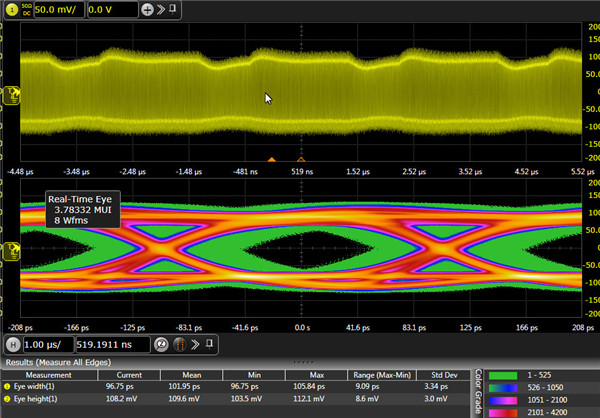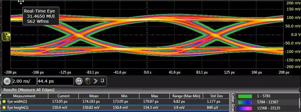 下圖是觀測(cè)鏈路中發(fā)出的5Gbps的信號(hào),芯片打開了去加重,經(jīng)過10英寸左右走線,連接到示波器,我們可以看到在信號(hào)中測(cè)試的眼圖很清晰,為了簡(jiǎn)化起見,我們以50%的位置測(cè)量眼高EH,以0電平threshold測(cè)試眼寬EW,直接從測(cè)量數(shù)據(jù)得到眼高眼寬,可以看到眼高和眼寬分別達(dá)150mv和173ps