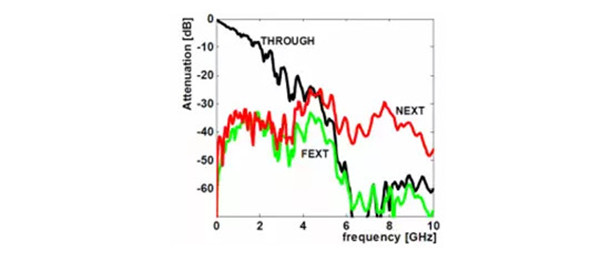對(duì)于高速無源鏈路來說,從頻域表達(dá)的傳遞函數(shù)是對(duì)鏈路間串?dāng)_程度描述的一個(gè)常用的方法,我們可以通過網(wǎng)絡(luò)儀VNA測(cè)量鏈路間近端或遠(yuǎn)端的插入損耗,對(duì)電纜或者PCB上相鄰鏈路間,分別測(cè)量NEXT或FEXT,定量反映在鏈路間頻域的傳遞特性。