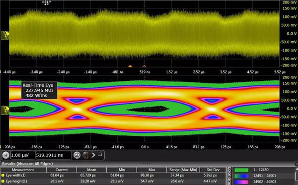 如果我們將FPGA板上的近端遠(yuǎn)端串?dāng)_,電源噪聲同時(shí)施加,可以看到眼圖變得非常的模糊,眼高和眼寬分別只剩下28mv和61ps,如果再考慮到鏈路損耗等因素,針對(duì)這樣的眼圖,即使打開接收端均衡,可能也無法獲得低誤碼率的傳輸能力